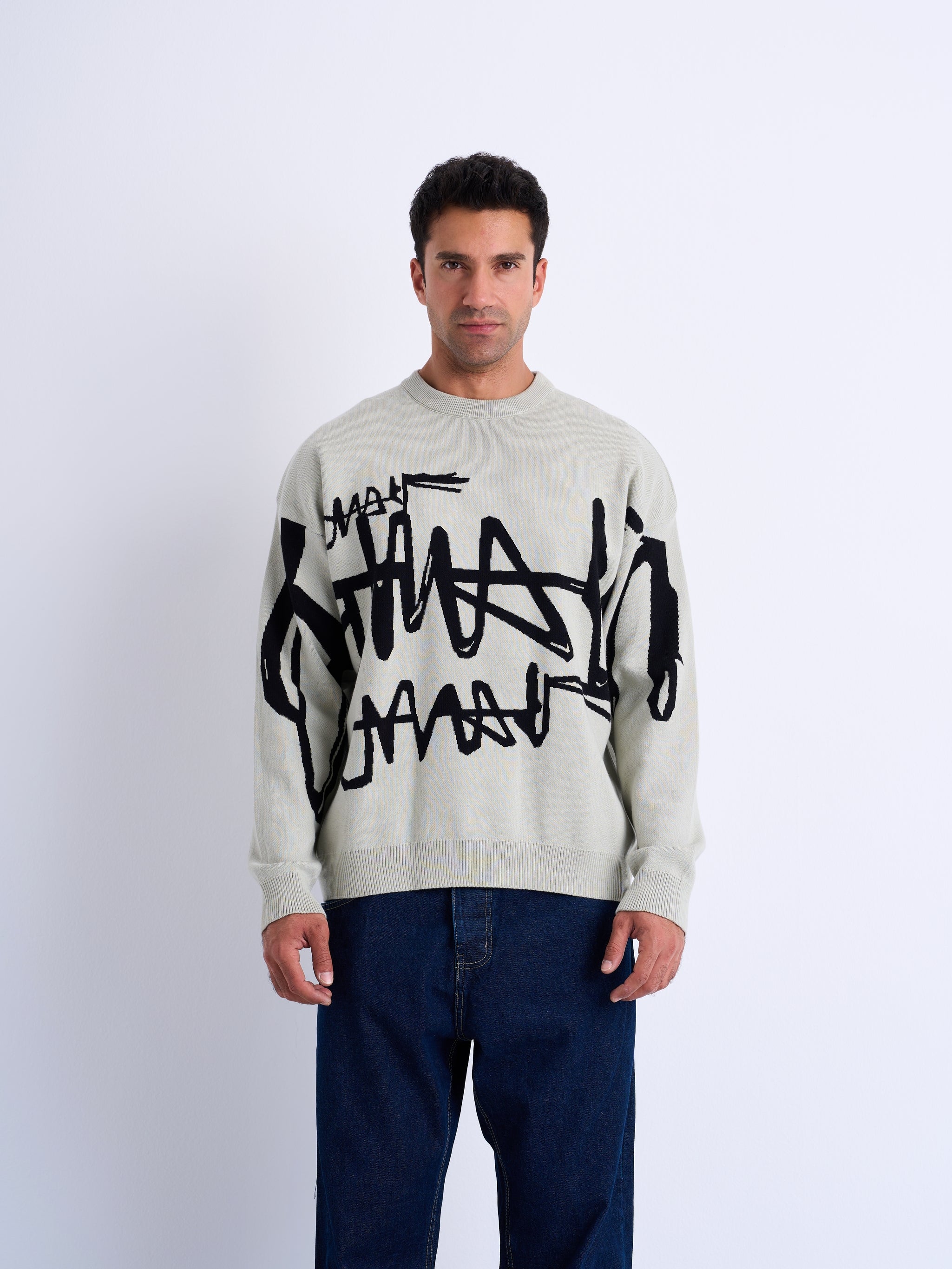 Unleash your creative edge with a bold fusion of street art and elevated knitwear. Featuring an abstract design that sprawls across the chest and sleeve, this piece turns everyday layering into a visual statement.