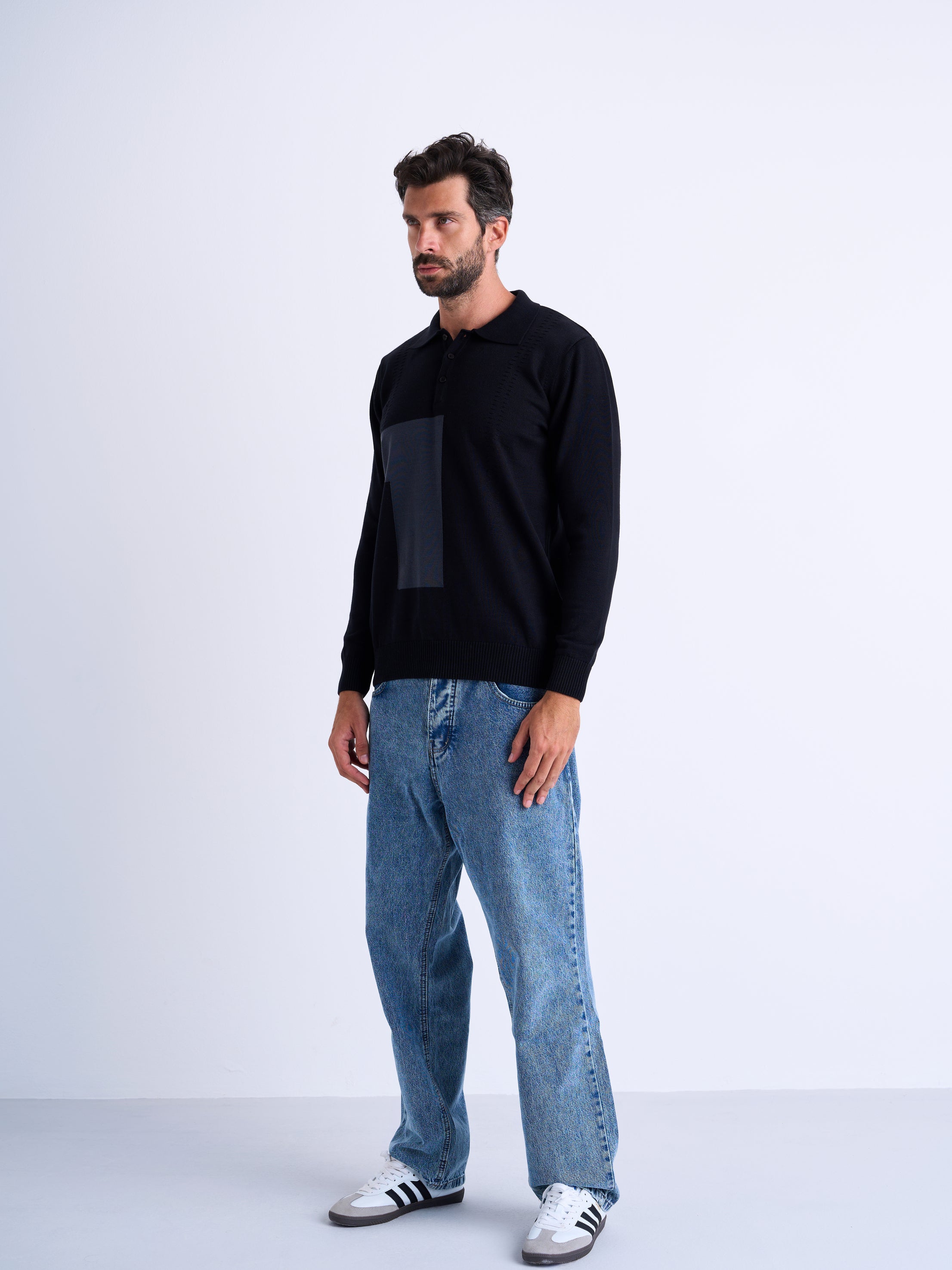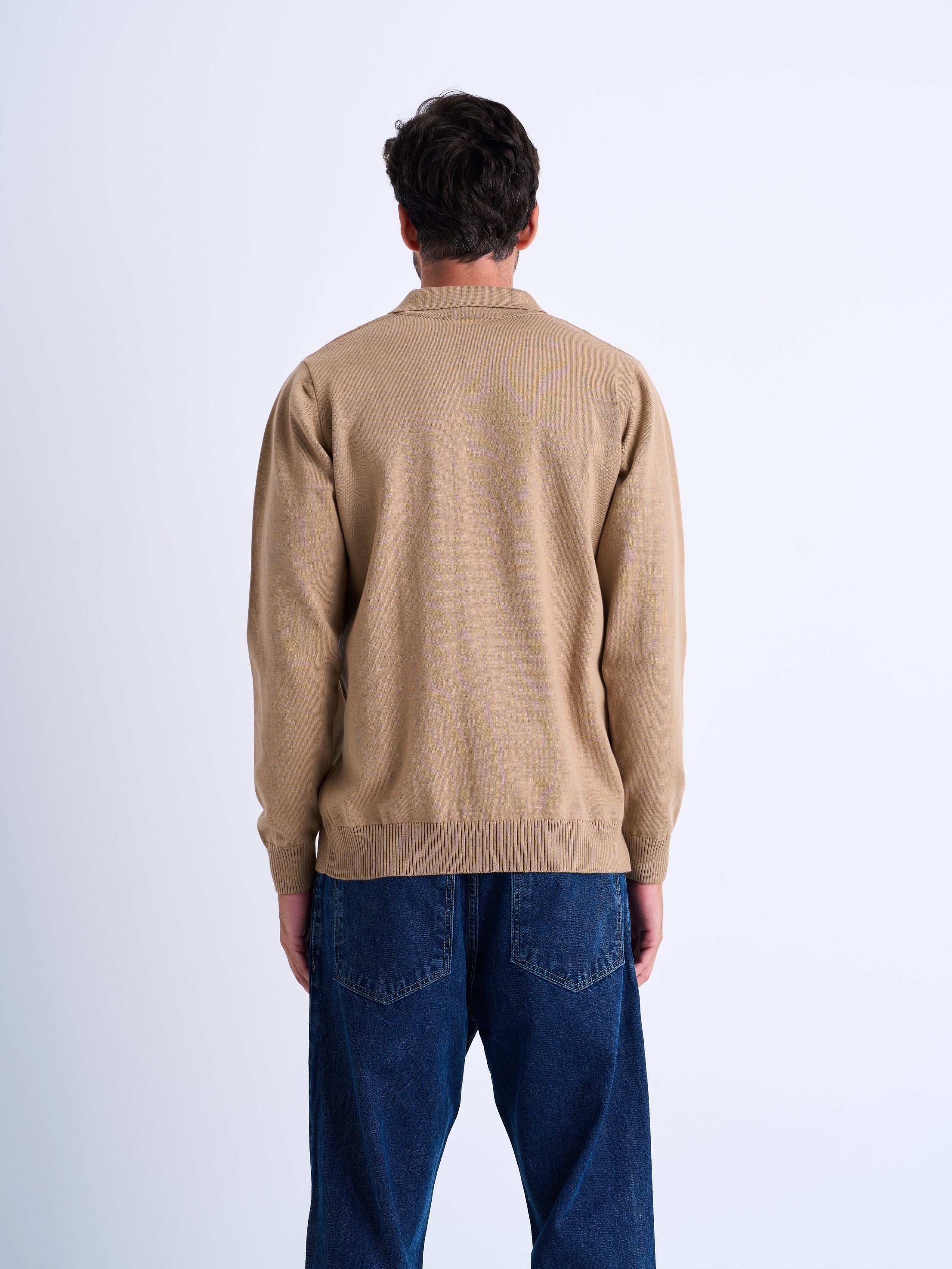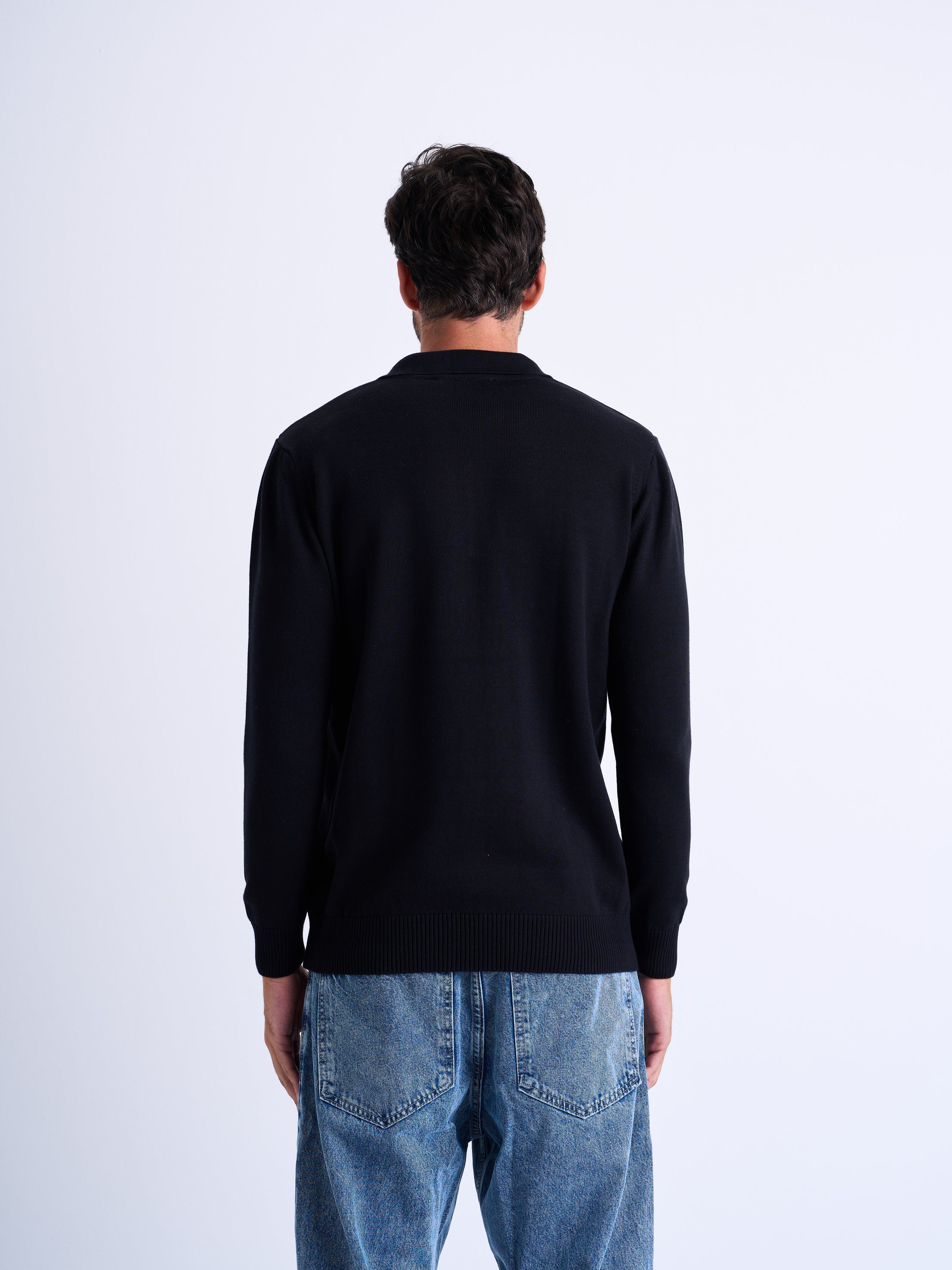 Relaxed fit polo sweater knitted with a curly textured yarn. Features a lapel collar with a button-up front. Long sleeves. Ribbed trims.